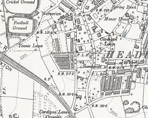 The landowner, Henry Cowper Marshall, returned to the previous plan of developing houses across the site. It was divided into building plots and sold off, with Cardigan Road, which runs from Burley Road to Kirkstall Lane, being driven through the centre of the former zoo in 1868; it was wider and faster than the old Chapel Lane. Villas with large gardens were erected on either side in what was known as the "Old Gardens Estate",[10] resisting the dense back-to-back type of development further down in Hyde Park during this era, with high-quality mansions in every plot by 1893.[11] Several notable local architects designed the villas, including Thomas Ambler, Charles Fowler, George Corson, Edward Birchall, and F W Bedford, making it a rather exclusive development with bespoke houses for prosperous clients. Several have subsequently been demolished and replaced with 1970s apartment buildings.[12]