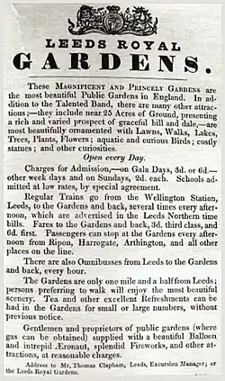 - ^ "Leeds Zoological and Botanical Gardens: Proposed Partial Opening on Sundays". The Leeds Mercury. No. 5619. 14 August 1841. p. 7. OCLC 32428267.