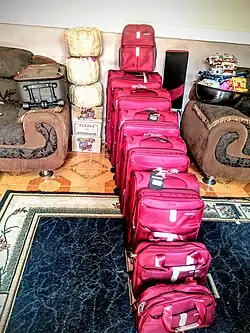 Akwati are the containers, boxes, or suitcases used to store and transport Kayan lefe to the bride's house. The number of Akwati required may vary depending on the bridegroom's family background. These containers serve the purpose of securely holding and transporting the Kayan lefe, ensuring its safe arrival at the bride's house.[6] Traditionally, two akwati were given to the bride's family. In the modern day, a set of six suitcases, called Akwatin aure, is the most popular choice.[4]
