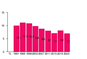 In the 2015 parliamentary election, the party received 211,615 votes, 7.1% of the total, and won 12 seats in the parliament.[23] In April 2016, Arhinmäki announced that he wouldn't seek another term as the party leader.[24] On 11 June 2016, Arhinmäki was succeeded by Li Andersson.[25] Under the leadership of Andersson, the party gained support in the 2017 municipal elections and the 2019 parliamentary election, in the latter, the party increased its representation in the parliament for the first time since 1995.[26][27]