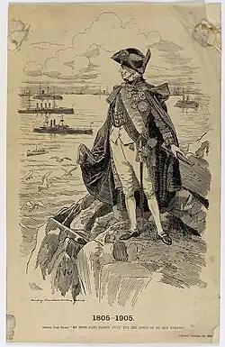 The signing of the Triple Entente in 1904 led to a call for muted celebrations of the centenary of Trafalgar the following year to avoid offending the French.[13] Some navy officers continued to emphasise the importance of Nelson, Jackie Fisher chose 21 October 1904 as the day to take up the office of First Sea Lord, and was fond of citing Nelson when implementing changes to the Navy. He also oversaw the naming of many navy ships after ships that had been at Trafalgar, or other Nelsonian battles, such as HMS Bellerophon, HMS Temeraire and HMS Superb; or after events or people in some way connected with him, such as HMS Collingwood and HMS St. Vincent. In many ways Fisher was preparing for a second Trafalgar.[14] He had even selected a new Nelson to lead the new Nelsonian style navy, John Jellicoe, of whom he wrote