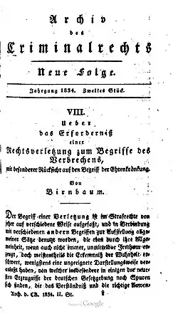 In 1834 Johann Michael Franz Birnbaum introduced the idea that crime is not established by the violation of rights, as P.J.A. Feuerbach had proposed, but only by the violation of legally protected goods.[8] In the later 19th century, Karl Binding and other German legal positivists involved in the drafting of the German Penal Code revived Birnbaum's concept of legal good.[8] In contast to Birnbaum, Binding regarded legal goods to be relevant only on a policy level, as guiding the work of the legislator. In Binding's view it was not the infringement of legal goods but the violation of a legal norm that made up the substance of crime.[9] Under Binding's interpretation, the concept of a legal good became a rationalization for expanding the state's criminal power rather than a basis for limiting it as Birnbaum had envisioned.[10]
