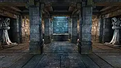 Eventually the party reaches the bottom level, signposted as "Prison". Inside, the source of the voice guides the player to reconstruct a broken machine which will activate a portal out of the dungeon, however upon assembling the parts and repairing it, the voice is revealed to be the machine itself, which manifests as a giant mechanical clockwork cube which attempts to crush the party. Escaping through a portal, the party locates the tomb of the creators of Grimrock Dungeon, who left behind scrolls explaining the dungeon's purpose of containing the machine, which they refer to as "the Undying One", until "the gears of time finally come to rest". The tomb also contains a weapon designed to be used in the event of the Undying One's escape from confinement.