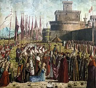 The prince respects the pact with St. Ursula, accompanying her in pilgrimage to Rome. Here, outside the city's walls, the pilgrims are welcomed by the Pope, who will baptize the pagan prince and crown the spouses. Here too the ceremonial is reminiscent of the Venetian ones, and the didascalos is also present next to the Pope, in a red toga and with the appearance of the Renaissance humanist Ermolao Barbaro.