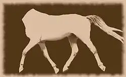 This three-legged horse comes from the Doubs department, as it lives in the woods of Nancray, in the middle mountains overlooking Besançon,[30] but also frequents a few other places.[31] The lightness of the three-legged would have "nothing to equal it among the Cossacks and the Bedouins". It is said that the skilful squire who managed to restrain him would do with this strange animal whatever he pleased. But once three-legged is freed from it, it is forever; he escapes like a dash and goes to find, in the depths of the woods, his natural gait and the days of his freedom.[16][32][33]