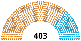 The Uttar Pradesh Legislative Assembly, also known as Uttar Pradesh Vidhan Sabha, is the lower house of bicameral legislature of the Indian state Uttar Pradesh.[1] There are 403 seats in the house. Members of the Assembly are elected by an adult universal suffrage and a first-past-the-post system to represent their respective constituencies, and they hold their seats for five years or until the body is dissolved by the Governor on the advice of the council of ministers. The house meets in the Vidhan Sabha Chambers of the Vidhan Bhavan, Lucknow is the capital.