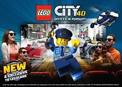 Lego City 4D - Officer in Pursuit is a 4-D animated short film attraction based on Lego City. It was released in Legoland California on 12 April 2019 and then rolled out to other Legoland parks and Legoland Discovery Centres in 2019. The film has a runtime of 12 minutes and uses a variety of sensory effects to enhance the experience. The plot focuses on the Lego City police as they pursue a robber in a high-speed chase through the streets of the city. The film was produced by Pure Imagination Studios and distributed by The Lego Group.