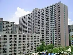 Lei Muk Shue Estate (Chinese : 梨木樹邨 ) is a public housing estate in Sheung Kwai Chung , Tsuen Wan , New Territories , Hong Kong, near the exit of Shing Mun Tunnels . It is the largest public housing estate in the Tsuen Wan District , with a population of 28,100 as of December 2021.[ 1] Although it is geographically located in Sheung Kwai Chung (literally means "Upper Kwai Chung"), administratively it belongs to the Tsuen Wan District[ 2] instead of the Kwai Tsing District because it is at the west of Wo Yi Hop Road, the boundary between the two districts.