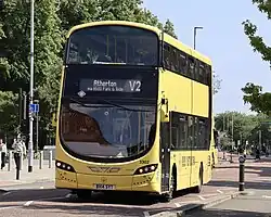 Services were initially operated by 20 Wright Eclipse Gemini 3 bodied Volvo B5LH hybrid double-decker buses in purple-livery. These were equipped with CCTV and next stop audio and visual announcements, USB charging points and free Wi-Fi.[22] Five more buses were purchased in January 2017 to provide extra capacity at busy times and facilitate the extended service to Central Manchester Hospitals.[23][24] Further buses entered service in September 2018 to operate the V4 service from Ellenbrook, as standard vehicles not adapted for busway running.[25]