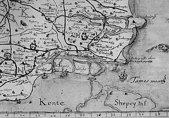 Shown on John Norden's 1594 map with the second word insula (with the traditional medial "ſ"), facing the 'Isle' of Grain rather than a Latinised "Sheppey insula" to the southeast, is a close eastern division which is perhaps the part that later almost wholly merged into the present island, with a ditch being the current boundary, having the same far eastern points as the Canvey Point and Leighbeck Point marshes. Two Tree Island to the north is also recognisable, if halved in length.