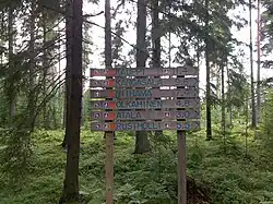 The area's street names includes both Kalevala-themed and canine-themed nomenclatures, the latter based on the old place called Koiramäki ("dog hill").[2] Instead, the street names Lukinkatu, Mikkolankatu and Vestonkatu refer to old main buildings of the historical village. The name of Karjumäenkatu is based on Karjumäki ("boar hill"), located north of the street, which was once used as a pig pasture. The Pulkkisenkatu and Pulkkisenraitti are both named after Pulkkisenmäki, and the Pulkkinen's smokehouse is remembered as the last in the area.[3]