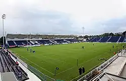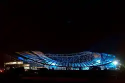Leinster play their home games primarily at the 18,500-capacity RDS Arena ('the RDS') in Dublin, although larger games are played in the 51,700-capacity Aviva Stadium when the capacity of the RDS is insufficient, or during 2024 and 2025 to accommodate venue improvements at the RDS, with occasional on-off games been moved to Croke Park, home of the Gaelic Athletic Association and by some distance the largest stadium in Ireland.[1] Before moving to the RDS in 2005, Leinster's traditional home ground was Donnybrook Stadium, in Dublin 4. The province plays primarily in blue with white or yellow trim and the team crest features a harp within a rugby ball, the harp being an ancient symbol of the province found in and taken from the flag of Leinster, although the traditional colours of Leinster Rugby mean the design more resembles the flag of the president of Ireland or the coat of arms of Ireland.
