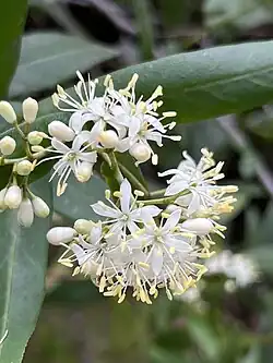 Leionema ambiens is a rare shrub growing in the Guyra district of New South Wales and Queensland, Australia. It has long stem clasping leaves and heads of white flowers in spring and early summer.