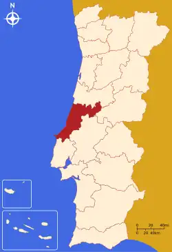 The District of Leiria (Portuguese: Distrito de Leiria [lɐjˈɾi.ɐ] ) is a district located between the Oeste e Vale do Tejo and Centro regions of Portugal, and divided between the traditional provinces of Beira Litoral and Estremadura. It borders on the north with district of Coimbra, on the east with district of Castelo Branco and with district of Santarém, on the south with district of Lisbon and on the west with the Atlantic Ocean. The district capital is the city of Leiria.