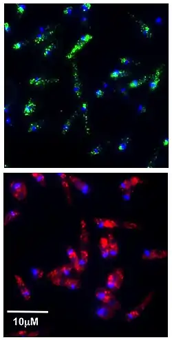 | Leishmaniavirus detected in Leishmania guyanensis parasites by immunofluorescence microscopy [1] Blue: DAPI-stained parasitic DNA Green: Leishmaniavirus dsRNA Red: Leishmaniavirus capsid | |