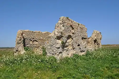 The site of the Leiston old abbey is identified with that of a ruined chapel at Minsmere, which stands near the sea on a marsh-girt island approached by a causeway from Eastbridge.[12] This belief, long uncertain, gained support from aerial photography which appeared to show cropmarks suggesting an extensive complex there.[13] It has since been shown that the chapel was not part of the original abbey, but was constructed on the site of the original monastery church soon after its removal in 1363.[14][15] The suggestion was made by Alfred Suckling in 1848 that Ranulf may have chosen a site which had been used for religious purposes in Anglo-Saxon times.[16]