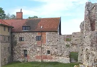 The cloister wall on the east side shows the openings of the sacristy, the chapter house and (possibly) the infirmary, but the dormitory which ran above it and the body of the main structure is gone. This range extended further away to the south, towards the reredorter, two walls of which are standing. The full extent of the cloister south range is occupied by the walls of the Refectory, a high hall lit principally by a very tall west window, its arch still dominating that corner of the site. Standing walls from the ground storey of the western range, which probably included the cellarer's quarters, complete the enclosure of the cloister, rising towards the western end of the church nave. The main external entrance to the cloister ran through this building, and in around 1500 a tall brick gatehouse with two octagonal turrets was added, one side of which still remains.[52] At the north-western corner of the complex, a former farmhouse with a brick regency front represents the western limit of the church nave, an early timber house stands longways behind it occupying the former south aisle of the church, and a tall more recent building stands within the cloister yard itself.