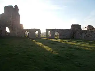 In November 1362 the abbot and convent obtained royal licence to rebuild their abbey in a safer place. The existing buildings near the sea faced ruin, having been "destroyed and drowned by flooding of the sea", and could not be repaired because the foundations were compromised.[42] Robert de Ufford was mindful of his family interest as a de Valoines (and de Pecche) descendant: his brother Ralph, of the third Ufford generation to serve as Justiciar of Ireland,[43] was buried at Campsey Priory in 1346. The site now occupied by the abbey ruins at Leiston was chosen (some two-and-a-half miles west of the other), the plan of a new and splendid abbey was laid out, and construction began. Earl Robert died in 1369, and was buried beside his countess at Campsey Priory.[44][45]