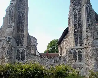 The title and associated estates passed to his son William de Ufford.[43] It was in or shortly before 1380 that, having been withdrawn from the ravages of the sea, the entire newly built monastery apart from its church was destroyed by fire, together with their corn and other goods. (Traces of this may be represented by areas of reddening in the surviving fabric.) The Abbot and convent were obliged to petition for a writ of supersedeas for distraint of the tenth, being thrown completely into debt and deprived of subsistence, and were granted this relief.[46] Whether this fire was a harbinger of the Peasants' Revolt in East Anglia in 1381, or the result of accidental causes, is not reported. William de Ufford was certainly vigorous in suppressing that destructive uprising, but died suddenly without heir in 1382 and was buried at Campsey Priory. In the wake of the fire the last major rebuilding took place: the Earl's will, written 12 June 1381, left 500 marks to Leiston Abbey.[47]