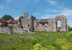 Ranulf de Glanville, who was born at Stratford St Andrew, married Bertha, daughter of Theobald de Valoines, Lord of Parham.[9] In 1171 he founded the Priory of Augustinian canons at Butley, a few miles south of Leiston, on lands settled upon his wife by her father as a marriage endowment.[10] The Premonstratensian house of Leiston ("Leystone") Abbey was planned less than a decade later, and a received date for its foundation was 1183.[11] Close ties existed between the two houses, and with the Augustinian nuns at Campsey Priory, a de Valoines foundation established shortly before 1195.
