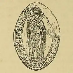 In these and subsequent grants and confirmations Ranulf's family took part as witnesses and grantors, the de Valoines and Walters, the Glanvilles, and the families of his sons-in-law, the de Aubervilles, the de Ardenes and the fitz Ralphs.[21] Roger de Glanvill granted the church at Middleton and William de Valoines that of St Botolph at Culpho. Ranulf died at the Siege of Acre in 1190, and the patronage of Leiston Abbey and of Butley Priory, with the manor of Benhall, passed to his daughter Matilda (Maud), wife of William de Auberville the elder, of Westenhanger, Kent, justiciar and knight in the fee of Simon de Averenches.[22] In 1192 William and Matilda founded the Premonstratensian house of Langdon Abbey,[23] at West Langdon in Kent, as from Leiston Abbey: the act was given under the hand of Abbot Robert of Leiston and witnessed by Gilbert, Prior of Butley.[24] Patronage descended with Benhall to Matilda's son Hugh de Auberville, whose brother Robert de Auberville was a benefactor of Robertsbridge Abbey, and to Hugh's son William de Auberville the younger (died 1248). This William's attempt to assert rights of advowson at Butley Priory was stoutly and successfully resisted.[25]