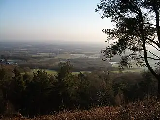 Leith Hill in southern England is the highest summit of the Greensand Ridge,[2] approximately 6.7 km (4 mi) southwest of Dorking, Surrey and 40.5 km (25 mi) southwest of central London. It reaches 294 m (965 ft) above sea level,[3] and is the second highest point in southeast England, after Walbury Hill in southwest Berkshire, (which is 297 m (974 ft) high).[1] Leith Hill is the highest ground for 79 km (49 mi).