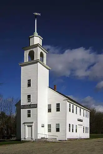 The meetinghouse was built in 1794, and is one of a modest number of New England meeting houses to survive from the 18th century, and one of a very small number with twin porches. It was built at town expense, serving as both a town hall and church until 1822. At that time it was divested of its religious functions and moved about 1 mile (1.6 km) to its present location. The upper gallery level was extended to create a second floor, and the box pews and pulpit were removed. A bell tower was added (with a Revere bell hung in 1824). It has since then served a variety of community functions, include Grange activities, the local library, a high school academy, and a local theatrical company.[2]