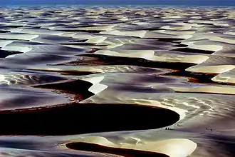 The sand is carried to the park from the interior of the continent by the Parnaíba and Preguiças rivers, where it is then driven back inland up to 50 kilometres (31 mi) by winds, creating a series of sand dunes rising as much as 40 metres (130 ft) tall.[3] During the rainy season, between the months of January and June, the rainstorms fill the spaces among the dunes with fresh water lagoons of up to 100 metres (330 ft) in length and 3 metres (10 ft) in depth, and together comprising as much as 41% of the area of the park.[5][7] The water in the lagoons is prevented from draining by a layer of impermeable rock located beneath the sandy surface.[2] The lagoons typically have a temperature between 27.5 °C (81.5 °F) and 32 °C (90 °F), pH of between 4.9 and 6.2, and low levels of dissolved nutrients.[8] When the dry season returns, the pools quickly evaporate, losing as much as 1 metre (3 ft) of depth per month.[7]