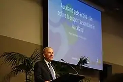 In August 2009, Brown announced that he would run for the mayoralty of the combined Auckland "super-city" in the 2010 Auckland mayoral election.[23] His campaign speech focused on delivering public transport, public ownership of the region's public assets, environmental protection, economic and social development.[23][24][25] He won the position by a majority of 65,945 votes over main rival candidate, Auckland City mayor John Banks,[1] on 9 October 2010, spending approximately $390,000.[26]
