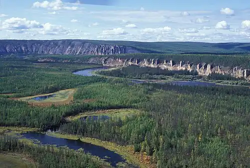 There are spectacularly eroded rock formations composed of gypsum-bearing and saline limestone, dolomite and, in some places sandstone, in different spots of the plateau. The Lena Pillars, lining the banks of river Lena in the region, are the most well-known of these features. They were declared a UNESCO World Heritage Site in 2012.[3] Other protected areas in the plateau are the Sinyyaya Pillars by river Sinyaya, and the Turuuk Khaya Rocks by the Lyutenge River.[4] The Olyokma Nature Reserve is located on the eastern side, partly within neighboring Aldan Highlands.[5]
