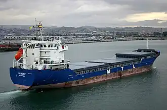 The single-deck ship was built in August 2008, and measures 108 metres (354 ft) by 18 metres (59 ft) with a gross tonnage of 5,598.[2][3] The ship has three holds with a hatch strength of 2.2 t/m2 and tanktop strength of 15 t/m2.[2] Hold 1 measures 15.2 x 18.9 x 11.2 m, hold 2 measures 15.2 x 29.4 x 9.1 m, and hold 3 measures 15.2 x 27.3 x 9.1 m.[2]