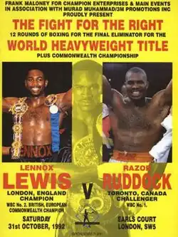 Lennox Lewis vs. Donovan Ruddock, billed as The Fight for the Right, was a professional boxing match contested on 31 October 1992.[3] The fight was a WBC heavyweight title "eliminator", with the winner scheduled to challenge the winner of the Evander Holyfield–Riddick Bowe championship bout held two weeks later. In addition, Lewis' Commonwealth heavyweight title was also on the line.