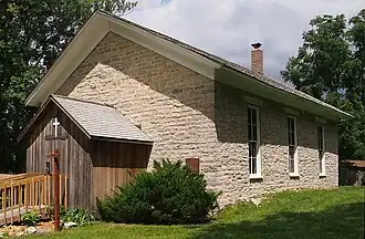 Construction on the church was stalled for the next eight years, with half-completed stone walls. In 1865 the area was seeing financial prosperity again, and a stonemason used material from the large uncompleted church to finish building it as a smaller structure. The church was opened in 1866 and dedicated by the Reverend Daniel Cobb. The area never really prospered, though, since the railroad bypassed Lenora.[2] In the late 1920s, the Lenora church was closed as an active congregation.