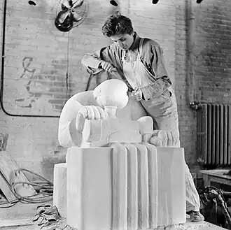 ![]() Lenore Thomas at work on a sculpture for the Resettlement Administration (1936) | |
