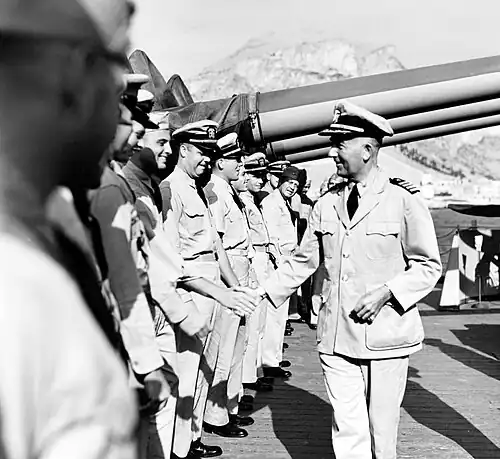 Upon the United States' entry into World War II, Thebaud once again found himself on escort duty in the North Atlantic. In October 1942, as Commander of Destroyer Squadron Thirteen, he served in tactical control of the largest multi-country convoy escort to date, with a US force of five destroyers, a British force of two destroyers and two corvettes, a Canadian force of one destroyer and seven corvettes, and one Free French corvette.[10] He later served as Commander, United States Escort Control and Senior Officer Present Afloat, Derry, Northern Ireland, supporting convoy operations.[4] Afterward, in command of the cruiser USS Boise in the Mediterranean, Thebaud was awarded the Legion of Merit with Combat "V" and the Army Bronze Oak Leaf Cluster for supporting for the Amphibious Battle of Gela during the Invasion of Sicily. He also received the Legion of Merit for supporting the Italian mainland landings at Salerno (12–19 September).[6] He received a fourth Legion of Merit while commanding Cruiser Division Ten in the Pacific Theater, during occupation of the Mariana Islands, strikes against the Bonin Islands and the Battle of the Philippine Sea. Following service as the Director of Naval Intelligence (October 1944 - September 1945),[11] he then served as Naval Attaché in Paris at the request of Fleet Admiral Ernest J. King.[12] Subsequently, he was named Inspector General of the Navy (July 1947 - June 1949) and then Commandant of the First Naval District (February 1949 - February 1952).[13] Additional decorations received by Thebaud include the Navy Commendation Medal, the Order of the British Empire (CBE),[14] the French Legion of Honour, the Czechoslovakian Order of Merit, and the Order of Yun Hui of the Republic of China. Thebaud was transferred to the retired list in 1952 and died on April 18, 1980, in Bethesda, Maryland.[4] He and his wife are buried at the United States Naval Academy Cemetery in Annapolis, Maryland.