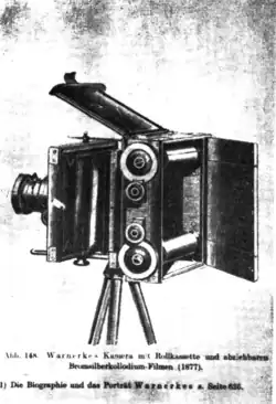 In 1875, Warnerke constructed a camera equipped with a special cassette for the film he produced in loads of 100 photos. A monorail bellows camera, it was one of the first cameras in the world that permitted taking such a large number of photos on a single load. Warnerke's construction was 9 years ahead of the 1884 invention of roll film by George W. Eastman and Fr. Hannibal Goodwin. Warnerke's camera had a small window of orange glass in the rear wall through which could be read the number of the negative's frame and position each precisely as the film was wound through; a device commonly used in later, modern cameras.