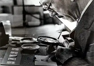 Working in watercolour with the aid of a magnifying glass, Fryer produced a stamp-sized impression of the proposed design. If approved, a larger original was created at a higher level of detail that formed the final artwork from which the stamp would be printed. Often this was by the recess method from a steel engraving as with the British Guiana 12c[12] but other printing methods used included typography as was used for the 1943 Belgian Congo postage due stamps[13] which were produced in five different values and colours to a common design by Fryer.[14]