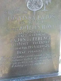 Zoltán Boros (now a filmmaker and composer), the son of the local Reformed priest and a survivor of the massacre, was then 5 years old.[6] On that day his father was in a labor camp.[6][5] He recalled that a local Romanian doctor, Augustin Pop, hid him and his then-seven-year-old sister in a dark room, and they were asked by their mother not to make any noise.[5] Later on, his mother told him that the doctor dressed her as a maid so that it would not raise any suspicion when the Romanian officers arrived.[5] One of the officers asked, "Well, we know the priest is in the camp, but where's his wife?"[5] The doctor answered that she had already left with the retreating Hungarians.[5][6] During the Ginta massacre, a villager named Lájos Togyinka showed what "Until death do us part" means because Togyinka was Romanian and the Romanian soldiers did not want to execute him, however his wife was Hungarian and Togyinka instead of fleeing chose death by the side of his wife. The officer in charge of the execution, Bridea, also ordered the 13 and 17-year-old-sons of Togyinka to be executed.[9] The grave of the murdered Togyinka family reads: "Kioltott ártatlan vérök annak a tanúja, hogy ártatlanul haltak. Aludjatok drága szereteink békén az Úrjézusban. A boldog viszontlátásra" (translated to English: "Their spilled innocent blood is the proof that they died innocent. Sleep our beloved ones in God Allmighty. A blissful good bye.")