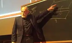 Leonard Susskind (/ˈsʌskɪnd/; born June 16, 1940)[2][3] is an American theoretical physicist, professor of theoretical physics at Stanford University and founding director of the Stanford Institute for Theoretical Physics. His research interests are string theory, quantum field theory, quantum statistical mechanics and quantum cosmology.[1] He is a member of the US National Academy of Sciences,[4] and the American Academy of Arts and Sciences,[5] an associate member of the faculty of Canada's Perimeter Institute for Theoretical Physics,[6] and a distinguished professor of the Korea Institute for Advanced Study.[7]