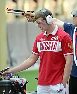 Leonid Aleksandrovich Yekimov (Russian: Леонид Александрович Екимов; born 13 September 1987) is a Russian sport shooter. At the 2006 ISSF World Shooting Championships, he won the junior competition in 25 metre pistol and finished second in 25 metre standard pistol. The following year, although still a junior, he opted to participate in the open class of the European Championships in 10 metre air pistol and helped the Russian team to a gold medal and a new world record, also breaking the junior world record of Kanstantsin Lukashyk in the qualification round. He then proceeded to defeat teammates Mikhail Nestruyev and Vladimir Isakov in the final, to top a Russian triple victory and win his first international senior title. He defended this gold medal the next year after a qualification score of 591 points, two points below the world record.[1]