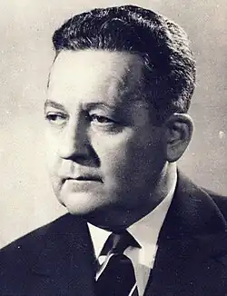 Răutu first impressed critics of the regime by being able to survive Pauker's downfall (1952), and was one of the very few of the wartime exiles not to be designated a "Right deviationist".[92] A theory first advanced by political scientist Ghiță Ionescu is that Gheorghiu-Dej relied on the party's "Bessarabian wing" to conspire against Pauker. This faction included Răutu, Borilă, and Emil Bodnăraș, all of whom enjoyed support from the emerging Soviet leader, Nikita Khrushchev.[93] Together with Constantinescu as the other PMR intellectual, Răutu initiated the campaign to purge all other supposed inner-party oppositionists, drafting the PMR resolution on prelucrări ("processing", a euphemism for "interrogations").[94] In his speeches to the PMR sections, Răutu described the cadre verification policy as inspired by the 19th CPSU Congress and its talk of "ideological work" being paramount in the consolidation of socialism.[95] He declared Pauker a saboteur of collectivization, and her associate Vasile Luca guilty of "criminal activity".[96]