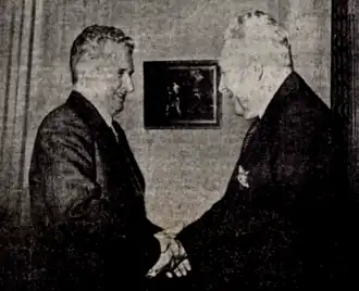 In 1964, while carrying on with his other functions, Răutu was serving as general secretary of the Foreign Trade Ministry.[53] Gheorghiu-Dej's terminal illness transformed him into an unconditional supporter of Ceaușescu, who was emerging as the new party leader; Niculescu-Mizil recalls being informed by Răutu that "you and I must obey Ceaușescu from now on".[189] Conflicted by his own social and ethnic origins,[5] Răutu sought good relations with Ceaușescu, a relationship strengthened due to the friendship between Răutu's wife Natalia and Elena Ceaușescu. His cordial rapport with the Ceaușescu couple, developed during the Gheorghiu-Dej era, together with (historians suggest) his chameleon-like persona,[5][190] helps account for his longevity in public life. Holding approximately equal party ranks, the two men and their families were also recipients of a luxury trip to France, arranged by Gheorghiu-Dej and with television presenter Tudor Vornicu as their guide.[191] Răutu managed to impress Ceaușescu, even though the latter was not just fearful of the PMR prison elite, but also a nationalist with antisemitic reactions.[192]