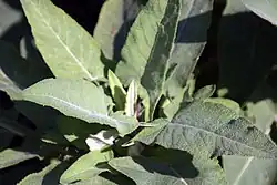 This species is an aromatic perennial shrub growing 0.3 to 2.3 m (0.98 to 7.55 ft) tall. The stems are 1 to 1.5 cm (0.39 to 0.59 in) thick and closely pubescent. Like in most Lamiaceae, the leaves are arranged opposite, attached to the stem by a petiole around 6.5 cm (2.6 in) long. The upper leaves towards the inflorescence are ovate and sessile. The leaves grow up to 32 cm (13 in) long and 15 cm (5.9 in) wide. The leaves are shaped hastate, with the leaf base cordate to auriculate, the leaf tip acute, and covered in velvety trichomes and raised veins.[5][6]