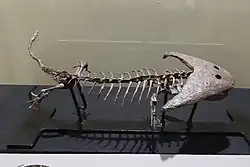 Lepospondyli is a diverse clade of early tetrapods. With the exception of one late-surviving lepospondyl from the Late Permian of Morocco (Diplocaulus minimus),[6] lepospondyls lived from the Visean stage of the Early Carboniferous to the Early Permian and were geographically restricted to what is now Europe and North America.[7][2] Five major groups of lepospondyls are known: Adelospondyli; Aïstopoda; Lysorophia; Microsauria; and Nectridea. Lepospondyls have a diverse range of body forms and include species with newt-like, eel- or snake-like, and lizard-like forms. Various species were aquatic, semiaquatic, or terrestrial. None were large (the biggest genus, the diplocaulid Diplocaulus, reached a meter in length, but most were much smaller), and they are assumed to have lived in specialized ecological niches not taken by the more numerous temnospondyl amphibians that coexisted with them in the Paleozoic. Lepospondyli was named in 1888 by Karl Alfred von Zittel, who coined the name to include some tetrapods from the Paleozoic that shared some specific characteristics in the notochord and teeth. Lepospondyls have sometimes been considered to be either related or ancestral to modern amphibians[8][3][4] or to Amniota (the clade containing reptiles and mammals).[9] It has been suggested that the grouping is polyphyletic, with aistopods being primitive stem-tetrapods, while recumbirostran microsaurs are primitive reptiles.[10]