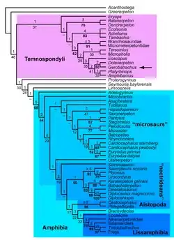 - ^ a b c d e Marcello Ruta, Michael I. Coates and Donald L. J. Quicke (2003). "Early tetrapod relationships revisited" (PDF). Biological Reviews. 78 (2): 251–345. doi:10.1017/S1464793102006103. PMID 12803423. S2CID 31298396.