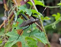 Leptoglossus[1] is a genus of true bugs in the leaf-footed bug family and the tribe Anisoscelini. Species are distributed throughout the Americas, with some records in eastern & southern Asia and Europe (mostly introductions).[2] Several species, such as Leptoglossus occidentalis, are economic pests of agricultural crops.[3][4] Like members of some other genera in the family, these bugs have leaflike dilations of the hind tibia. Several species are of economic importance, and one species, L. chilensis, has been reported to bite humans.[5]