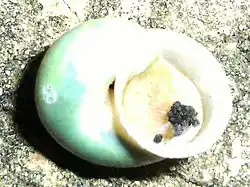 The shell width and height is about 14 mm (0.6 in) in females and 13 mm (0.5 in) in males.[3] The color of the shell is actually translucently milky-white, and the green color is from the mantle.