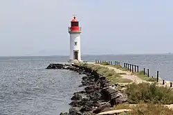The Les Onglous Lighthouse is the terminating point of the Canal du Midi where the canal enters the Étang de Thau.[1][2][3] The red and white lighthouse is at the tip of a short jetty projecting into the Étang de Thau. It is located on the east jetty at the canal entrance, about 1.5 km (0.93 mi) south of Marseillan in the Hérault department. The Isthmus of Onglous is a narrow strip of land between the Étang and the Mediterranean.[4]