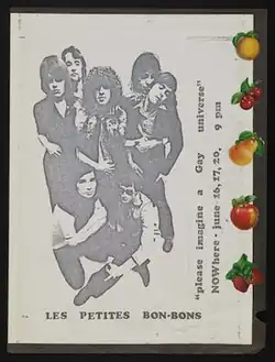 Les Petites Bon-Bons was a group of conceptual/life artists that originated in Milwaukee, Wisconsin, in the early 1970s. Their activities spanned the nascent gay activist movement, the international correspondence network and the Hollywood glitter rock scene.[1] They are known largely by the work of Jerry Dreva and Robert Lambert, aka Jerry and Bobby Bonbon, and who achieved much of their fame by effectively manipulating major media outlets.[2]