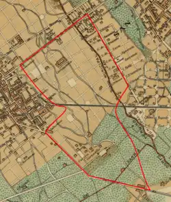 1890 map showing planned streets, with the modern boundary of Les Tres Torres